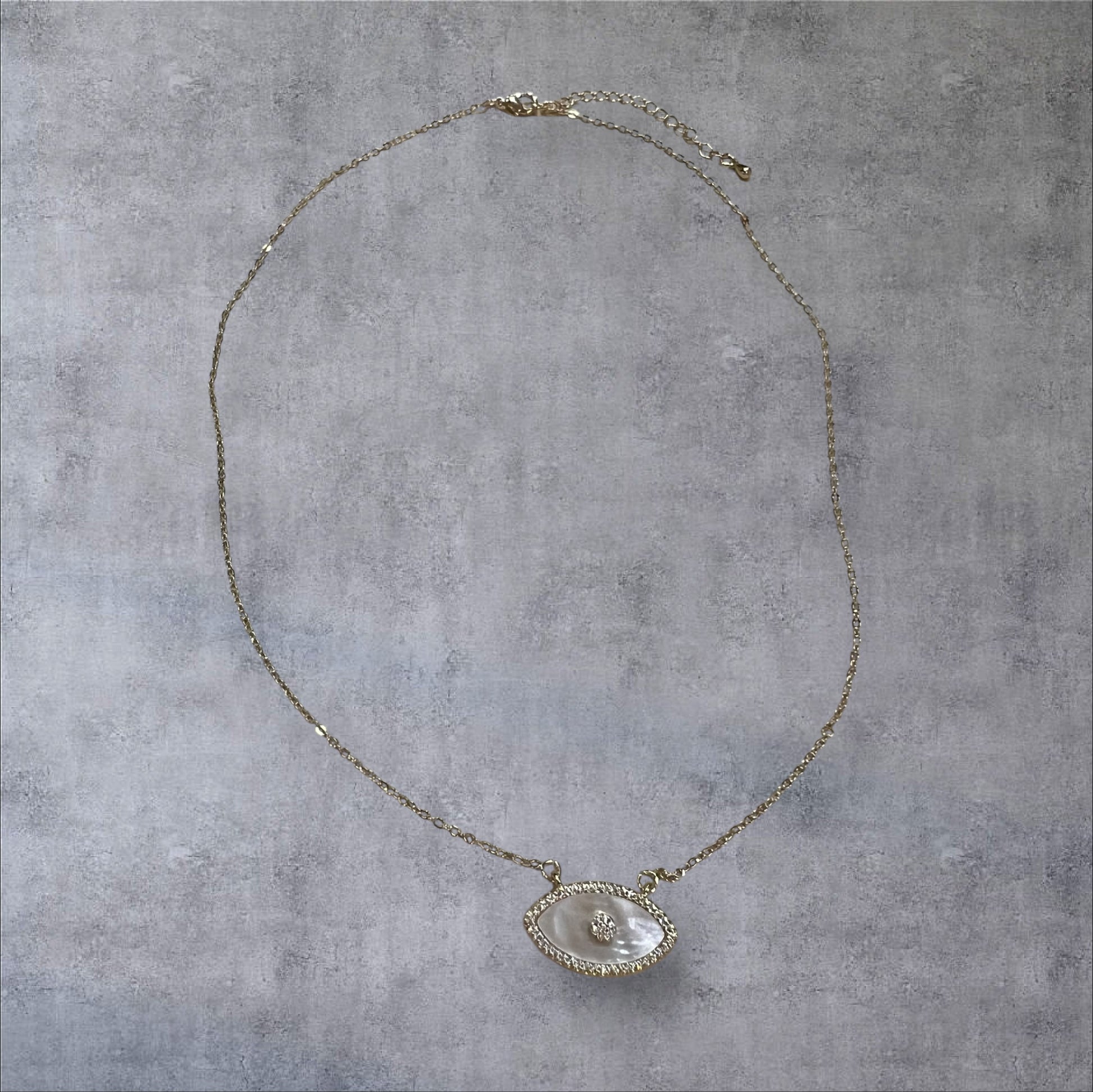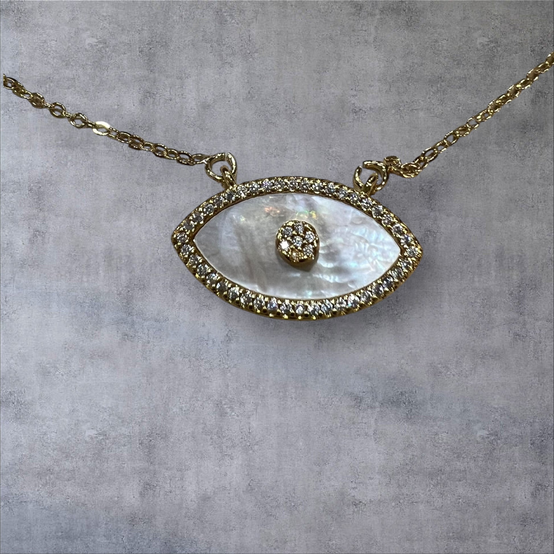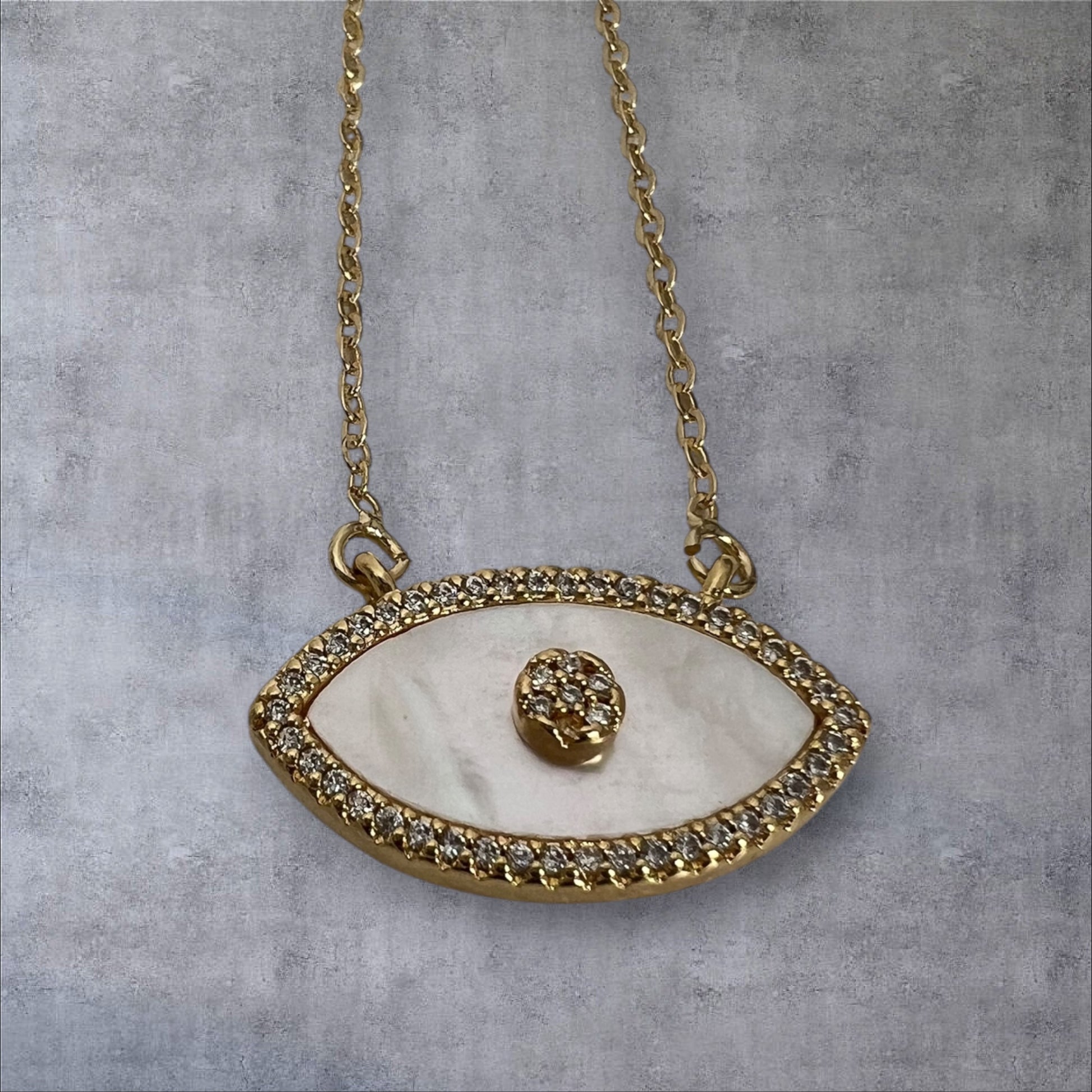 This Evil Eye Necklace is made from durable stainless steel and features a striking white enamel gold chain that is 8.5in long with a 2.5in extension. Its elegant design provides both style and protection from the Evil Eye, making it the perfect accessory for any occasion.