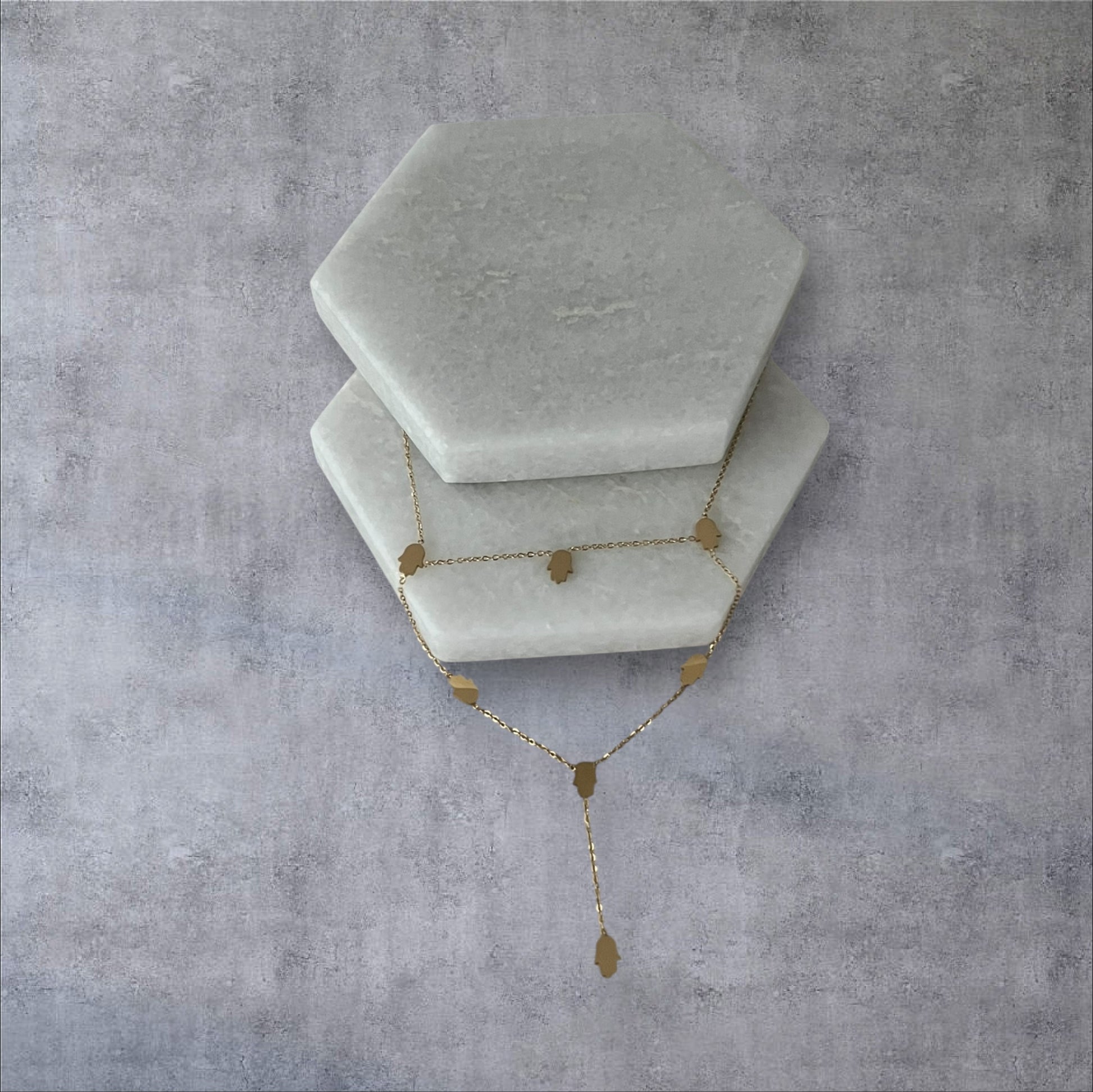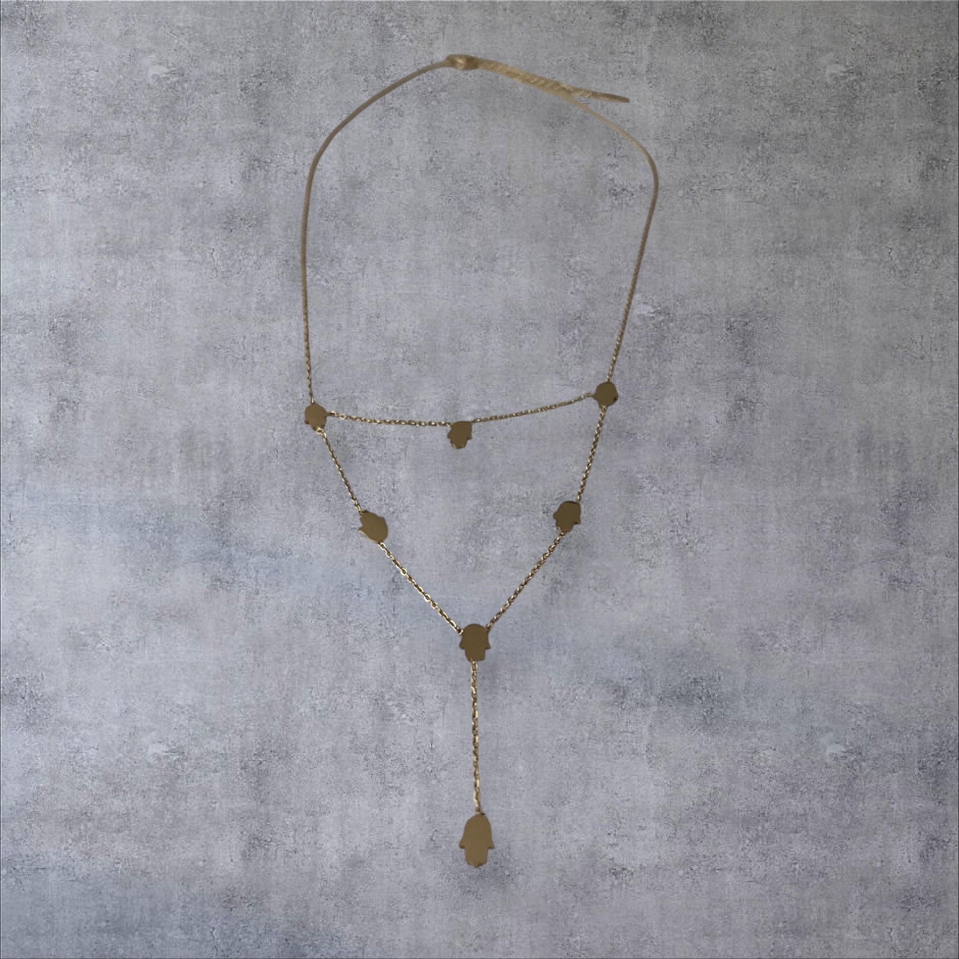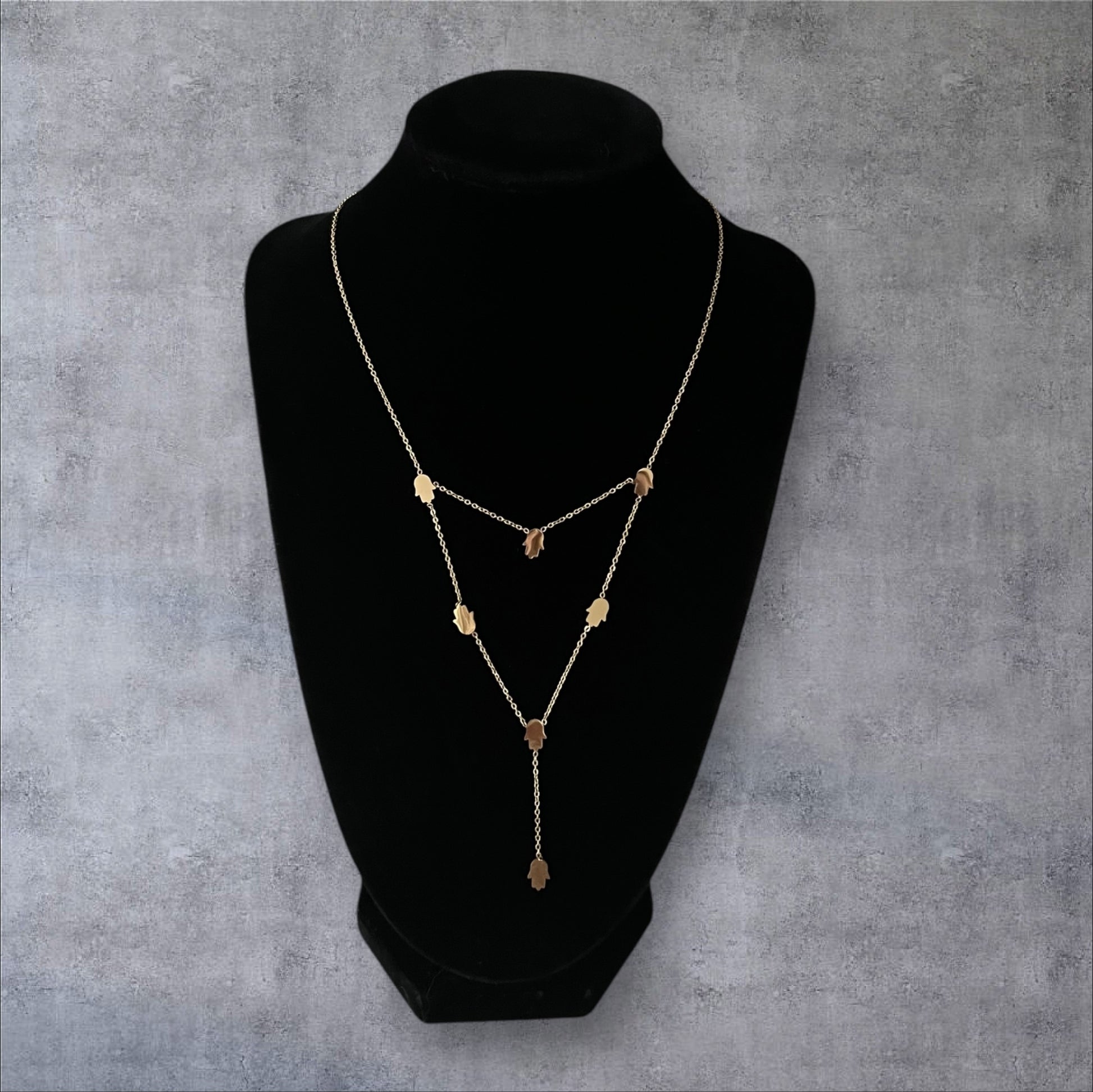 The Hands of Fatima gold necklace is a symbol of protection and strength. Made of durable stainless steel, it features layered mini palms and measures 10in in length with a 2 in extension. Stylish and meaningful, this necklace is perfect for everyday wear.