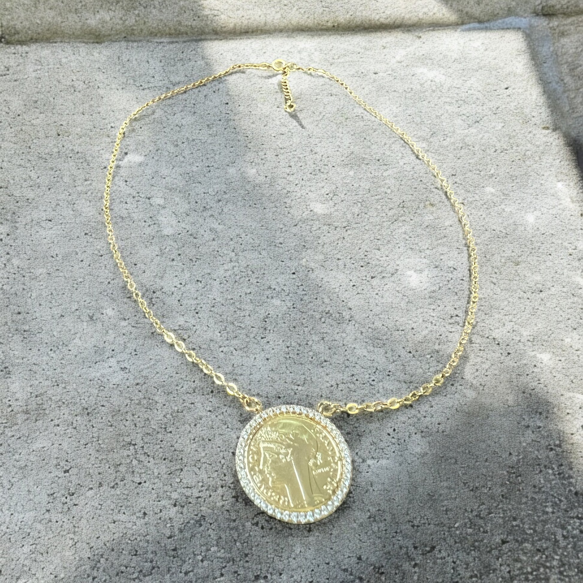 This stylish Coin Necklace features the Marianne symbol of the French Republic, crafted from durable stainless steel. The intricate pendant is accented with a sparkling crystal border, adding an elegant touch to any outfit. With its small extension, this fashion jewelry replica provides a versatile and timeless addition to your collection.