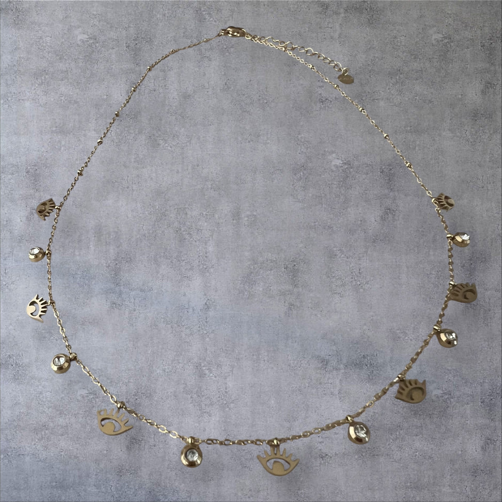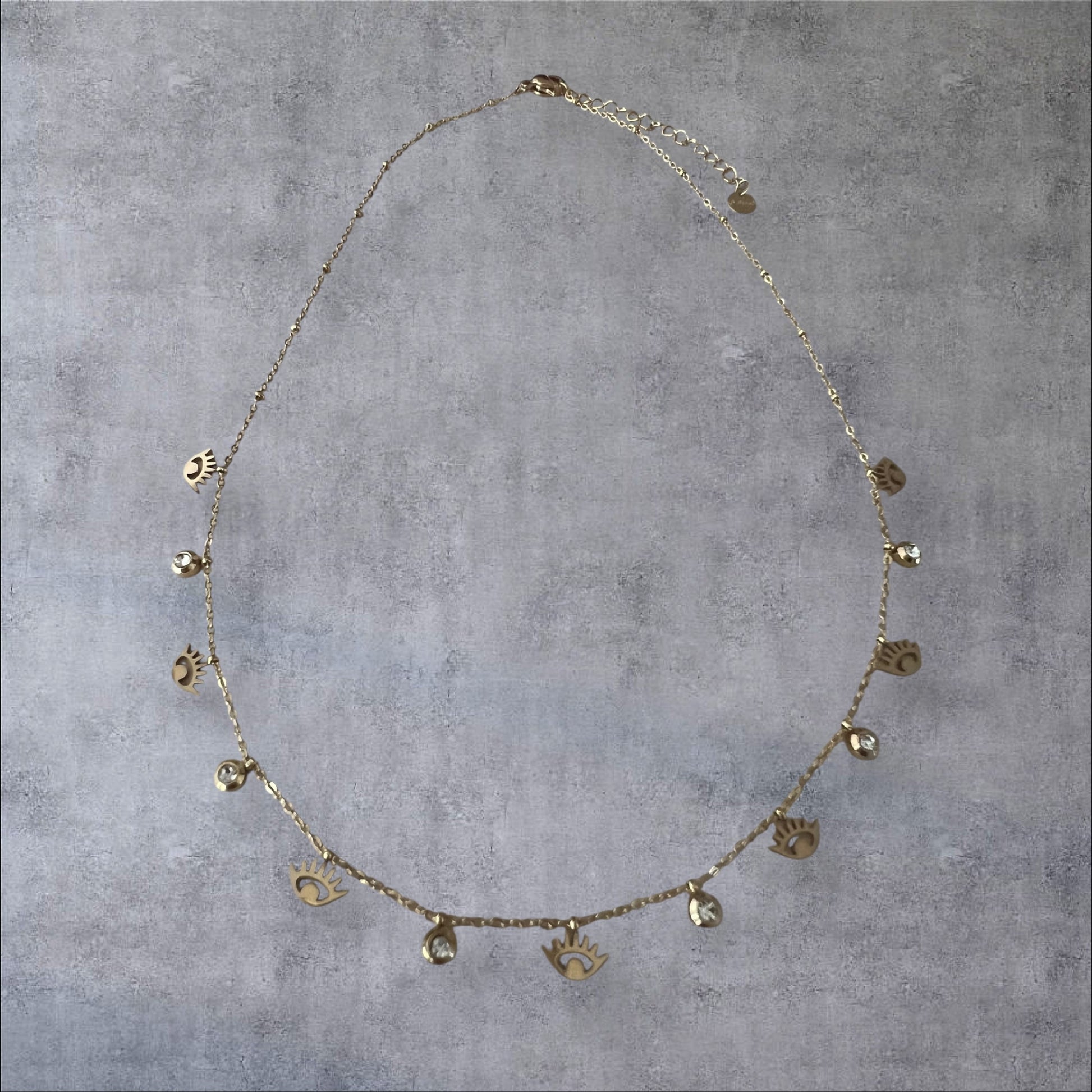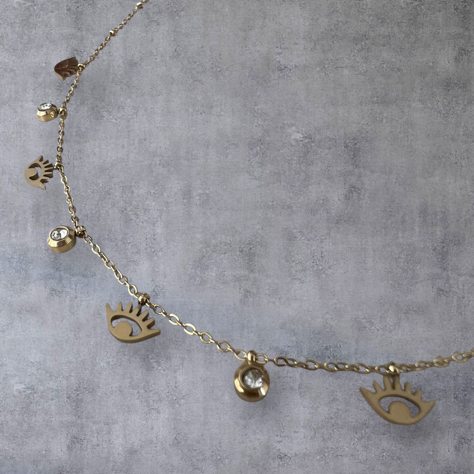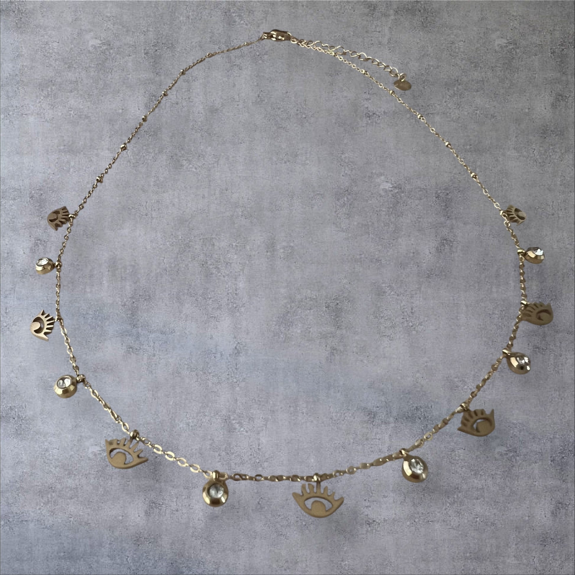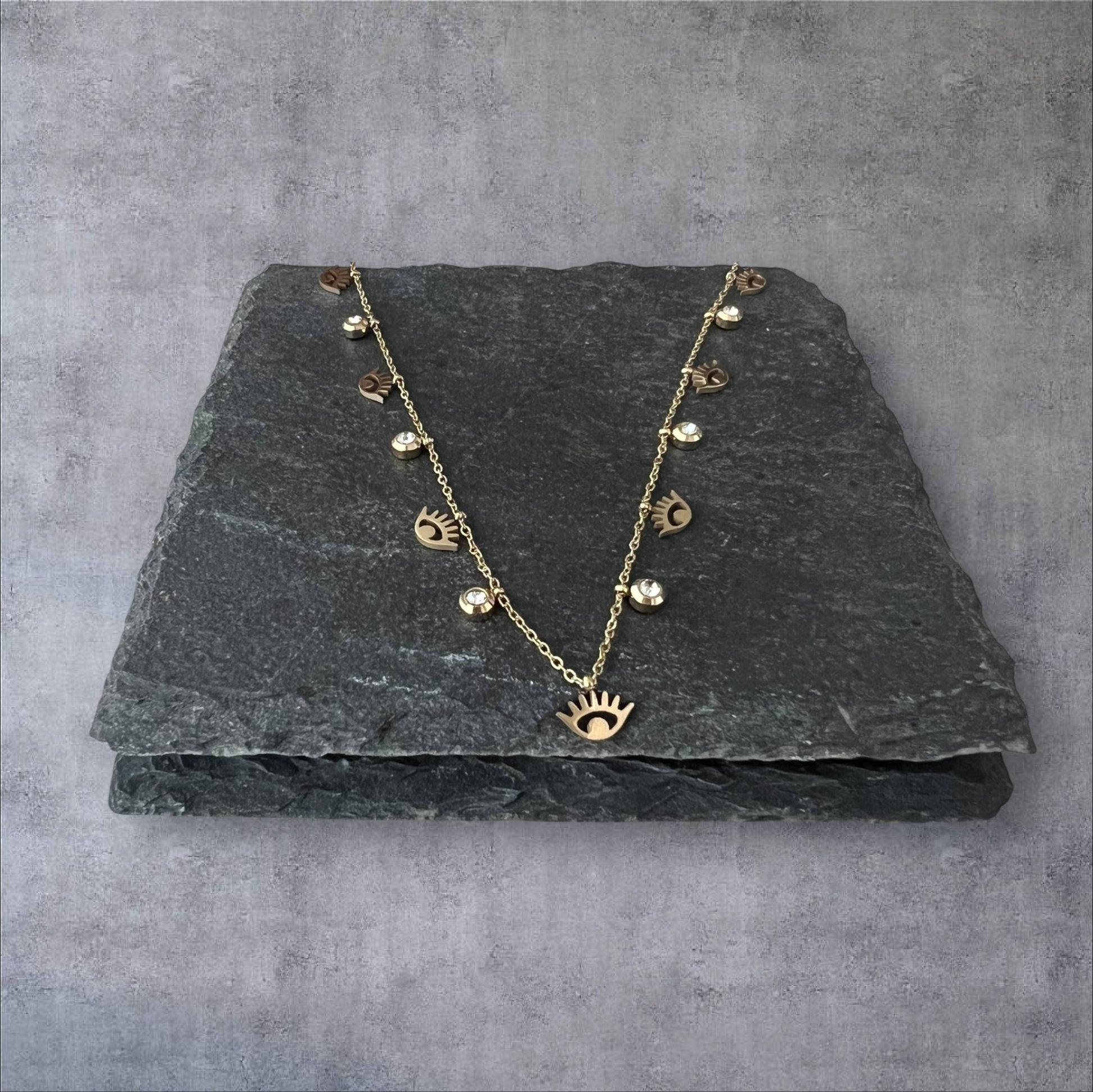 The Mini Evil Eye Necklace is a stylish and protective accessory. Made of durable stainless steel with crystal studs, this gold necklace measures 7.5 inches with a 2-inch extension for the perfect fit. Keep negative energy at bay with this elegant and versatile piece.