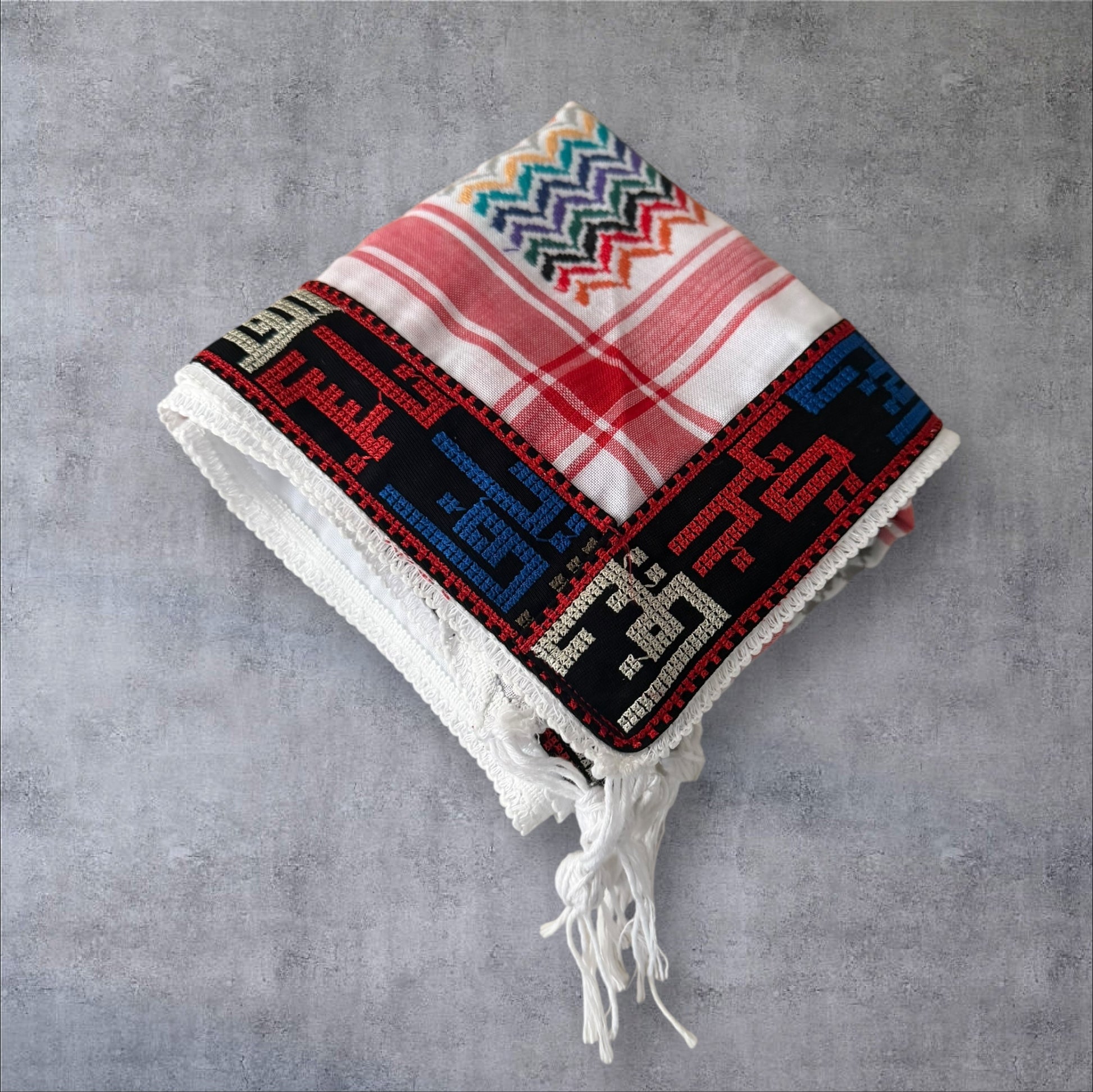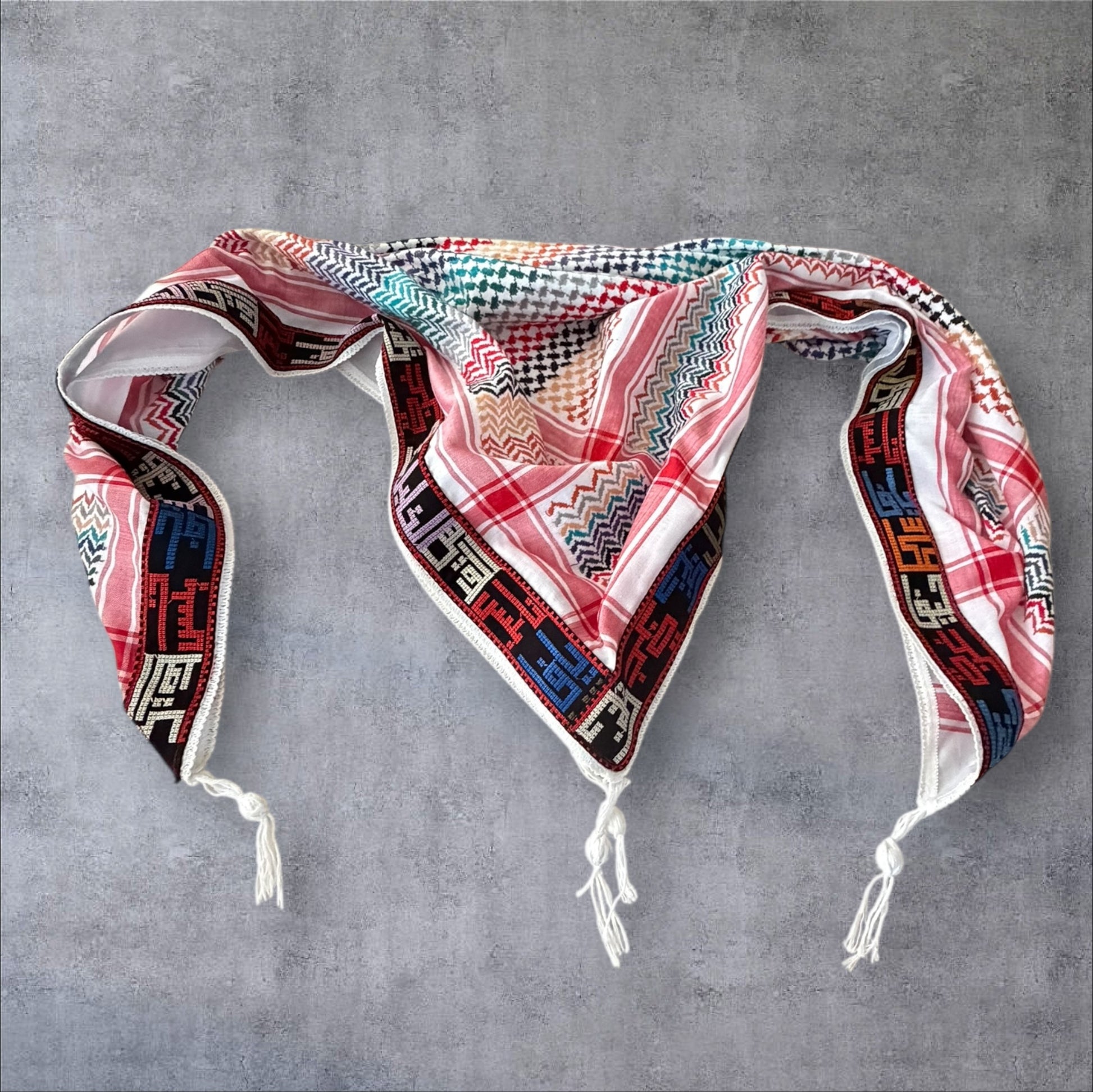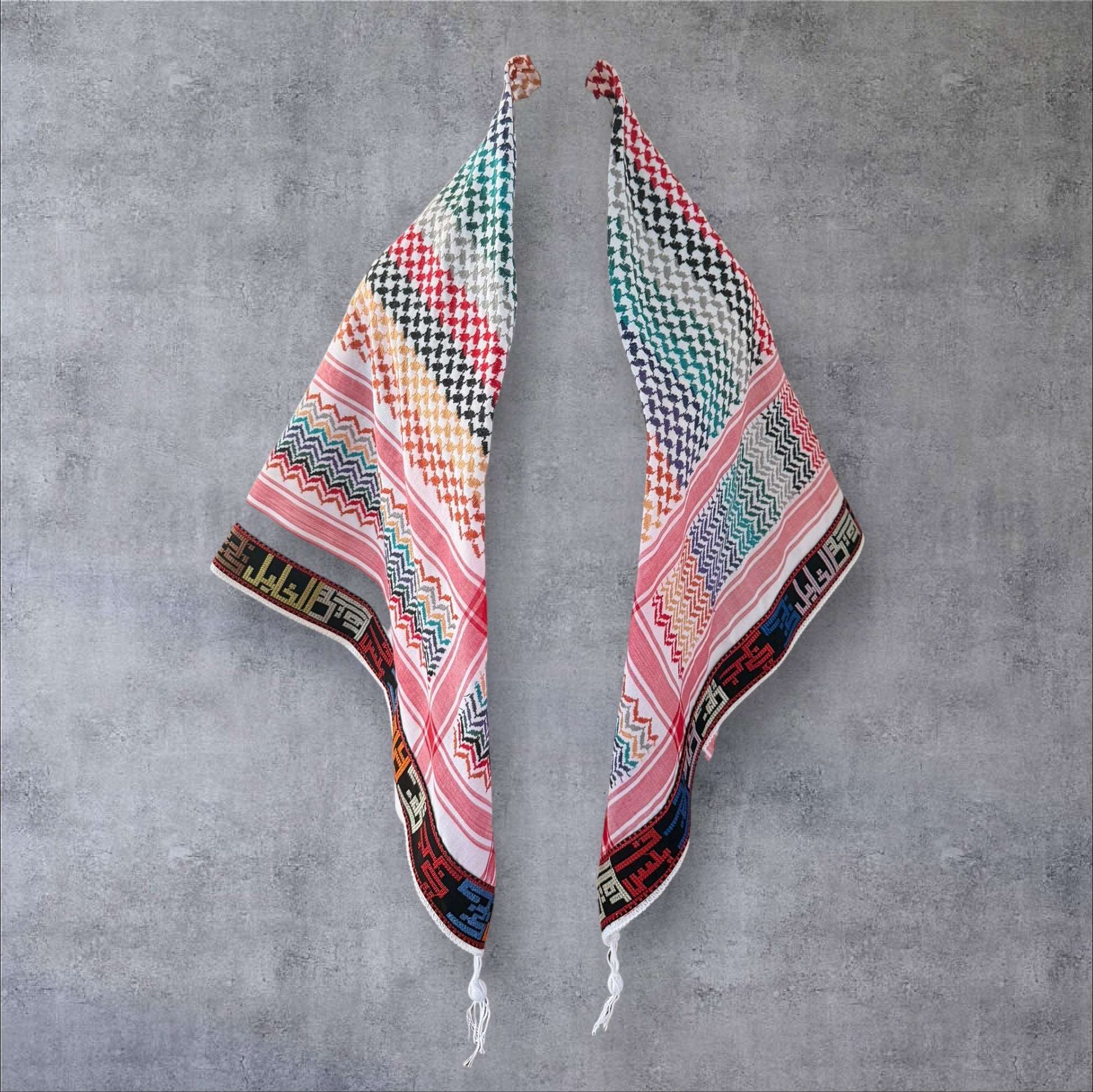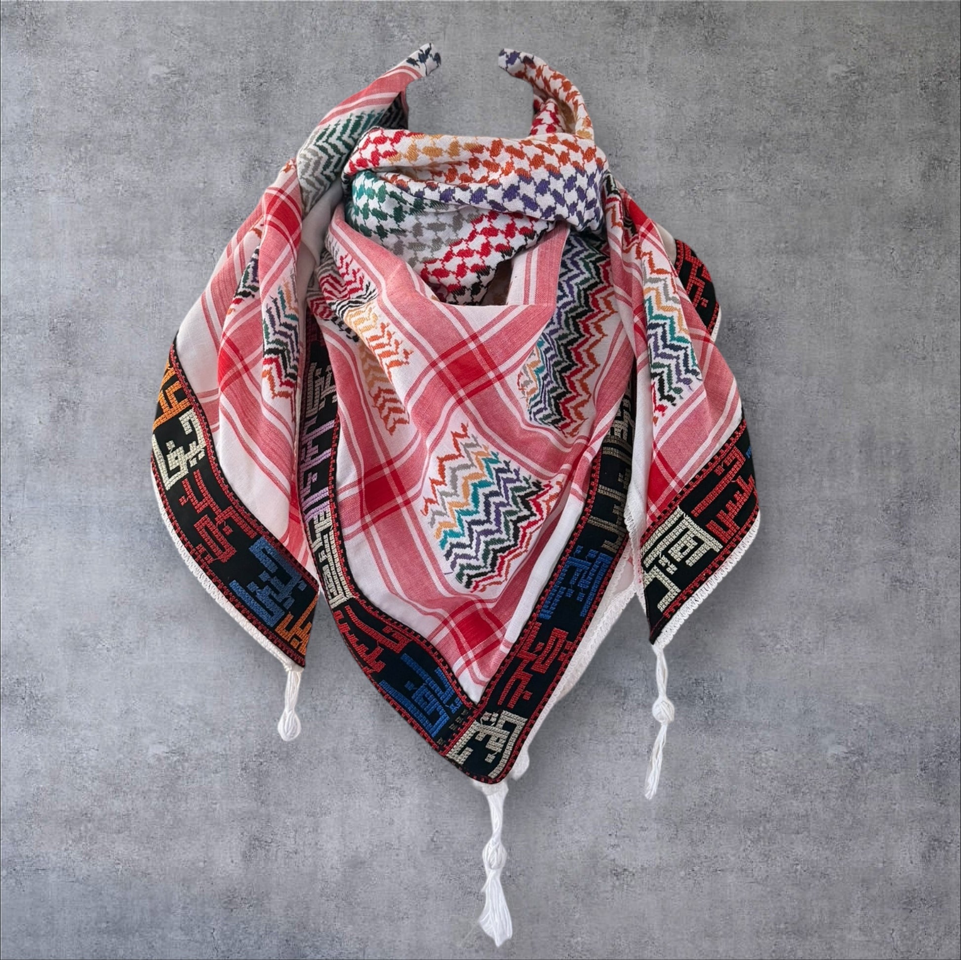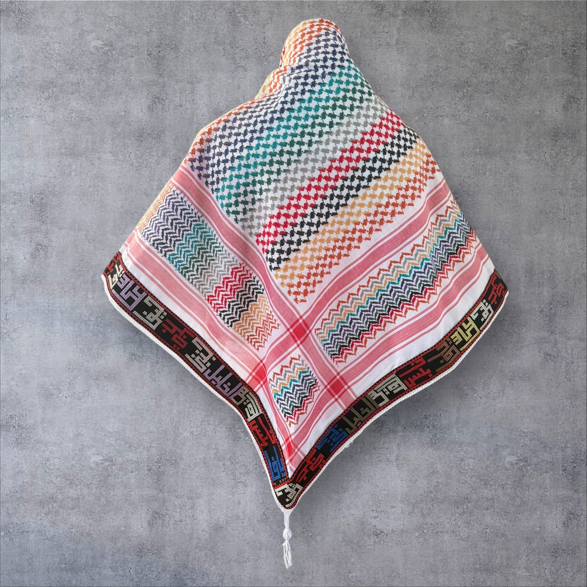 "Wrap yourself in the unique beauty of Palestine with our expertly designed Keffieh scarf. Featuring bold and vibrant colors along with elegant Arabic calligraphy showcasing Palestinian cities, this must-have accessory adds a touch of cultural richness to any wardrobe."