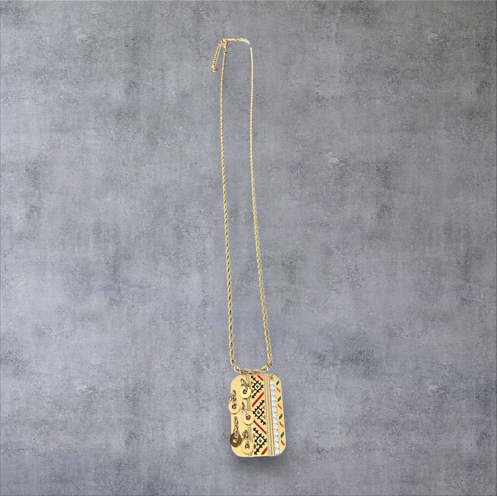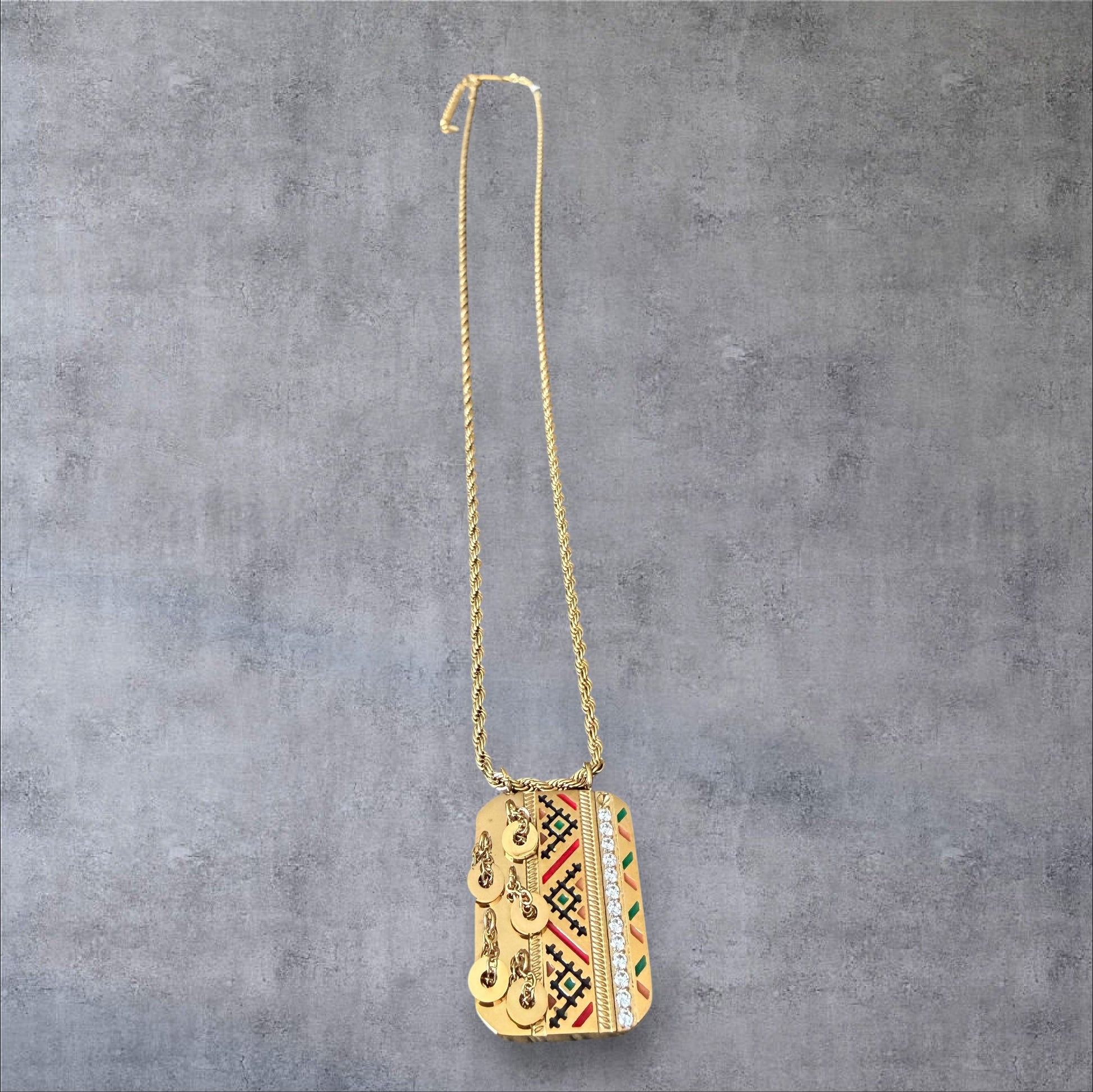 This stainless steel gold Tatreez Necklace features a 20-inch pendant adorned with a black and red Falahi design, complemented by a 2-inch extension for adjustable length. This necklace combines traditional artistry with modern functionality, making it suitable for various occasions while enhancing any attire with its striking design.