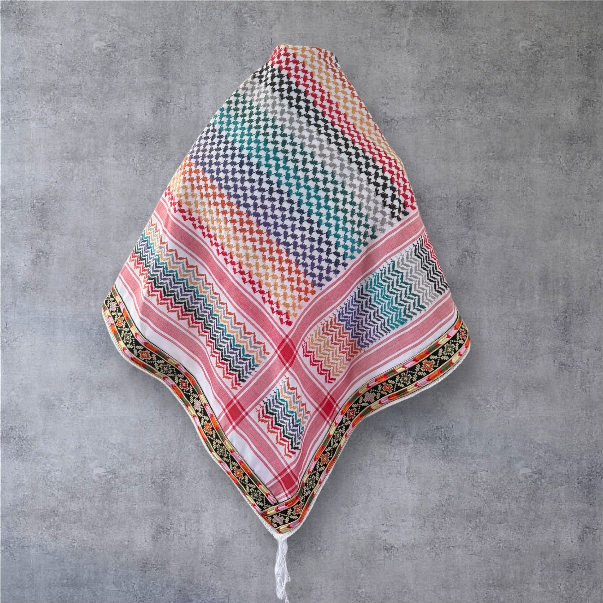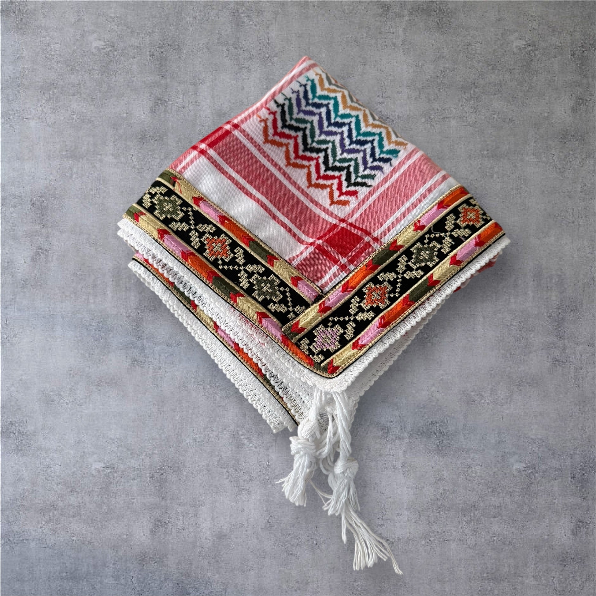 Expertly crafted by a Palestinian artisan, the Yasser Keffieh is a unique and vibrant addition to any wardrobe. Made with a traditional machine technique, this multicolor Keffieh features a stunning Tatreez border, showcasing the rich cultural heritage and craftsmanship of Palestine.